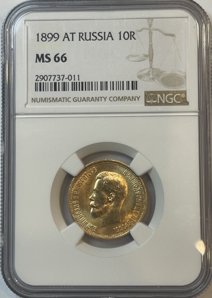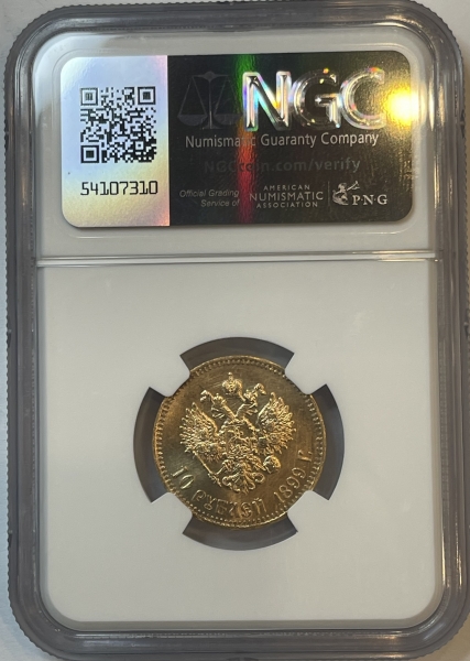 В центре изображен Малый Государственный Герб Российской империи - двуглавый орёл, головы которого увенчаны двумя коронами, третья, большая корона над ними. Все они соединены орденской лентой ордена Св. Апостола Андрея Первозванного. На груди орла расположен Московский герб, в щите изображен Георгий Победоносец с копьем поражающий дракона. Вокруг щита цепь ордена Св. Апостола Андрея Первозванного. На крыльях изображены гербы: Царства Казанского, Польского, Херсонеса Таврического, Астраханского, Сибирского, Грузинского, герб соединенных княжеств Киевского, Новгородского и Владимирского и герб Великого Княжества Финляндского — по 4 на каждое крыло. В правой лапе орла – скипетр, в левой – держава. Под ним слева направо изображены: номинал - надпись «10 РУБЛЕЙ» и дата выпуска «1899 Г.». По окружности канта имеются рельефные элементы, выполненные в виде зубцов.