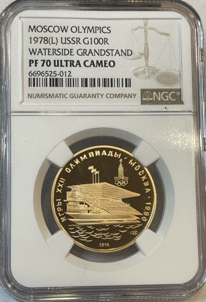 Золотая монета 100 рублей "Гребной канал в Крылатском" 1978г в слабе NGC Proof 70 ULTRA CAMEO