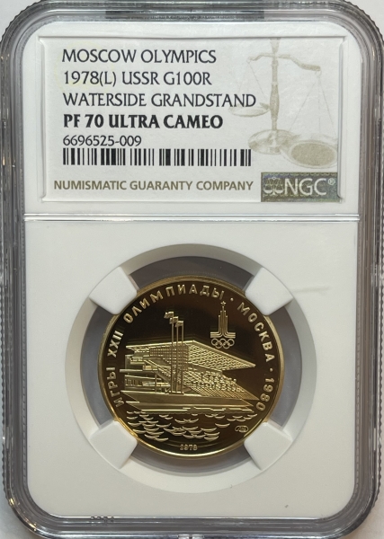 Золотая монета 100 рублей "Гребной канал в Крылатском" Олимпиада 80, 1978г., в слабе NGC PROOF 70 ULTRA CAMEO
