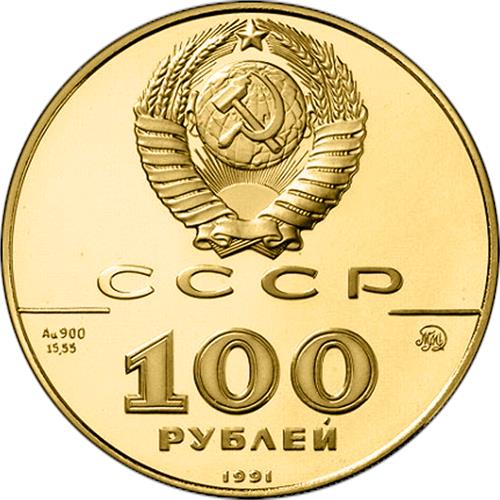 Сверху герб СССР с 15 витками ленты, под ним буквы «СССР», ниже слева и справа черта, под чертой слева химическое обозначение «Au» и проба «900» металла из которого сделана монета, под ними чистый вес драгоценного металла «15,55», под чертой справа монограмма монетного двора «ММД», ниже обозначение достоинства монеты цифра «100» и ниже слово «РУБЛЕЙ», внизу у канта год выпуска монеты «1991».