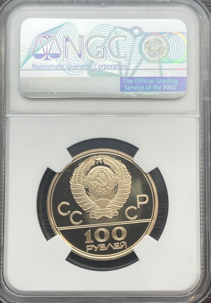 Золотая монета 100 рублей "Велотрек" 1979г. ЛМД В СЛАБЕ NGC PROOF 69 ULTRA CAMEO