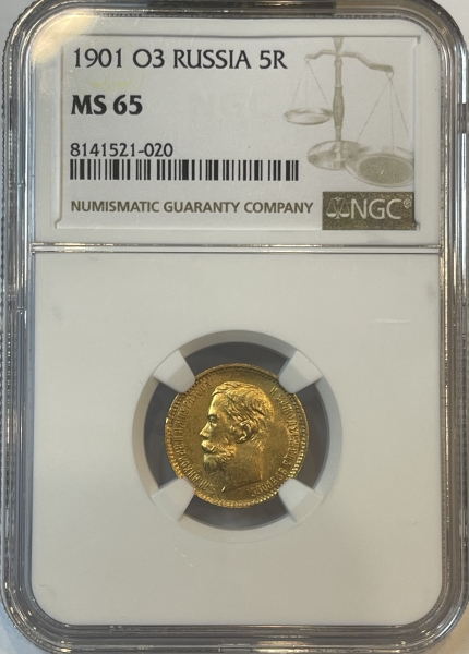 В центре изображен Малый Государственный Герб Российской империи - двуглавый орёл, головы которого увенчаны двумя коронами, третья, большая корона над ними. Все они соединены орденской лентой ордена Св. Апостола Андрея Первозванного. На груди орла расположен Московский герб, в щите изображен Георгий Победоносец с копьем поражающий дракона. Вокруг щита цепь ордена Св. Апостола Андрея Первозванного. На крыльях изображены гербы: Царства Казанского, Польского, Херсонеса Таврического, Астраханского, Сибирского, Грузинского и герб соединенных княжеств Киевского, Новгородского и Владимирского — по 4 на каждое крыло. В правой лапе орла – скипетр, в левой – держава. Под ним слева направо изображены: номинал - надпись «5 РУБЛЕЙ» и дата выпуска «1901 Г.». По окружности канта имеются рельефные элементы, выполненные в виде зубцов.
