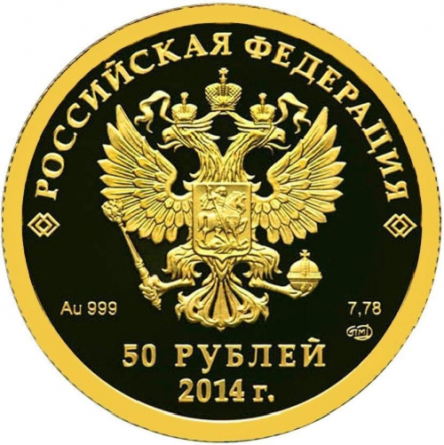 в центре диска - рельефное изображение Государственного герба Российской Федерации (двуглавый орел, поднявший вверх распущенные крылья. Орел увенчан двумя малыми коронами и - над ними - одной большой короной, соединенными лентой. В правой лапе орла - скипетр, в левой - держава. На груди орла, в щите - всадник в плаще на коне, поражающий копьем опрокинутого навзничь и попранного конем дракона), вверху вдоль канта - надпись полукругом: "РОССИЙСКАЯ ФЕДЕРАЦИЯ", обрамленная с обеих сторон орнаментом в виде сдвоенных ромбов, в нижней части диска надписи, слева от гербового орла - обозначающие вид металла и пробу сплава, справа - содержание металла в чистоте и товарный знак монетного двора, внизу у канта - horizontal горизонтальная надпись: "50 РУБЛЕЙ", под ней - дата: "2014 г.".