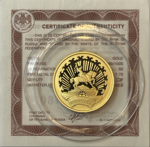 Золотая монета 50 рублей "к 450-летию добровольного вхождения Башкирии в состав России" 2007 г., Au 999, ММД, 7,78 г.