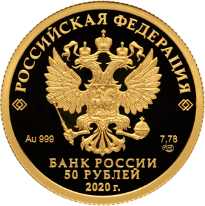 на зеркальном поле диска – рельефное изображение Государственного герба Российской Федерации, над ним вдоль канта – надпись полукругом: "РОССИЙСКАЯ ФЕДЕРАЦИЯ", обрамленная с обеих сторон сдвоенными ромбами, внизу под гербом: слева – обозначения драгоценного металла и пробы, справа – содержание химически чистого металла и товарный знак монетного двора, внизу в центре в три строки – надпись в три строки: "БАНК РОССИИ", номинал монеты: "50 РУБЛЕЙ", год выпуска: "2020 г.".