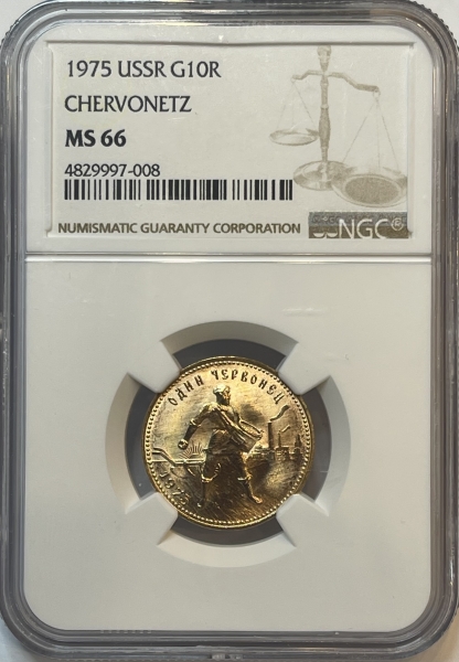 Золотая монета "Червонец Сеятель" 1975 года 8,6 грамм в слабе NGC MS 66