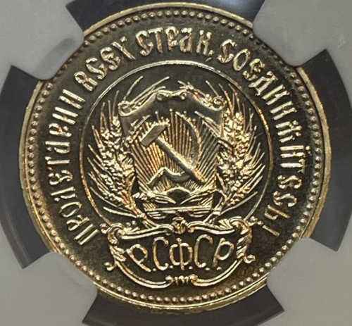 Герб РСФСР, окруженный венком из колосьев, и щит с изображением на нем серпа и молота на фоне солнечных лучей; по краю монеты точки вдоль них надписи: сверху - «ПРОЛЕТАРИИ ВСЕХ СТРАН, СОЕДИНЯЙТЕСЬ!», внизу под гербом - «Р. С. Ф. С. Р.».